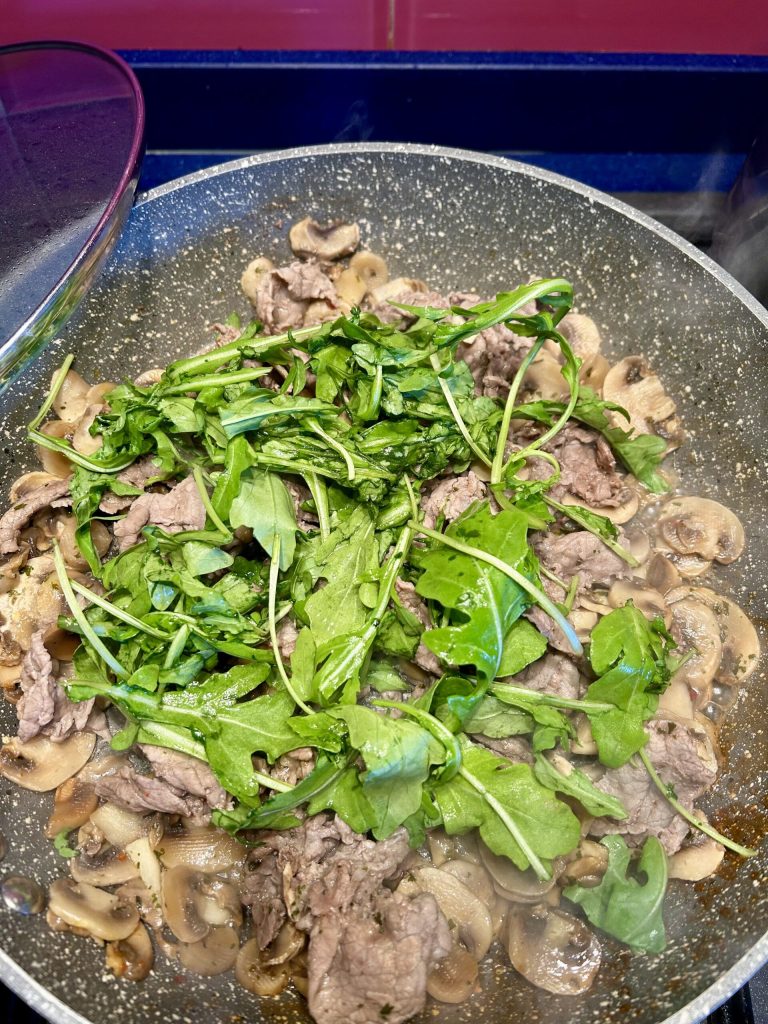 Wenn die Pilze und Streifen gar sind, schalten Sie die Hitze aus und fügen Sie den gereinigten und gewaschenen Rucola hinzu. Mischen Sie gut und Ihr Gericht ist servierfertig. Wenn Sie sehen, dass die Pilze und Streifen während des Kochens zu trocken geworden sind, können Sie etwas Weißwein hinzufügen, um diesen vor dem Hinzufügen des Rucolas zu verdampfen.
