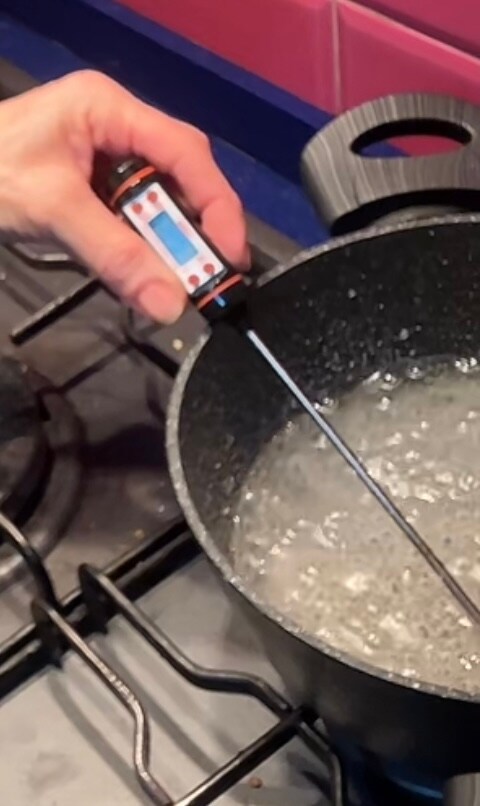 Was das Lebensmittelthermometer betrifft, ist es wichtig für den Zuckersirup, der 140° erreichen muss. In Haushaltswarengeschäften findet man Lebensmittelthermometer zu wirklich günstigen Preisen. Wenn Sie keins zu Hause haben oder nicht kaufen möchten, können Sie sich danach richten, den Sirup zu beobachten, wenn er kristallisiert, ohne sich wie Karamell zu verfärben.