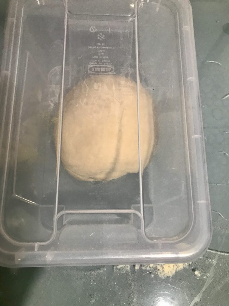 Wenn der Teig homogen ist, schalten Sie die Maschine aus und legen Sie ihn auf eine leicht bemehlte Arbeitsfläche, um mit den Händen eine Teigkugel zu formen, die Sie in einem abgedeckten Behälter gehen lassen. Ich verwende diese Plastikboxen und finde sie sehr gut, aber Sie können auch eine Glasschüssel mit Frischhaltefolie abdecken.