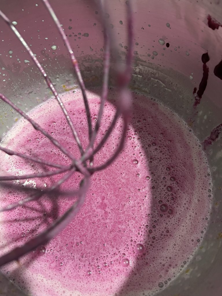 Wir beginnen die Zubereitung, indem wir die ganzen Eier mit dem Zucker aufschlagen, bis eine helle und schaumige Masse entsteht. Wir können dazu die Küchenmaschine mit Schneebesen verwenden oder einen elektrischen Schneebesen. Sobald die Eier aufgeschlagen sind, fügen wir nach und nach das Rote Bete-Püree hinzu und rühren mit dem Schneebesen weiter. Der Teig nimmt eine violette Farbe an. Dann geben wir das Pflanzenöl, die Milch, das Mehl, den Esslöffel Kakao, den Vanillinzucker und schließlich das Backpulver hinzu.