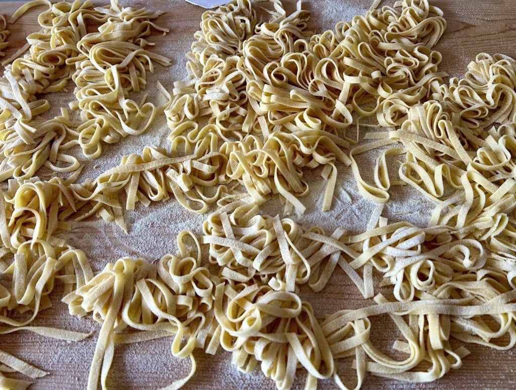 Die hausgemachten Fettuccine sind perfekt, wenn sie kurz nach dem Schneiden gekocht werden. Wenn Sie sie bis zum nächsten Tag aufbewahren möchten, empfehle ich, mit den Händen Nester zu formen und sie im Kühlschrank in Frischhaltefolie eingewickelt aufzubewahren. Beim Kochen lösen Sie sie nicht auf, werfen Sie sie in kochendes Wasser, so eingerollt lösen sie sich beim Kochen auf.