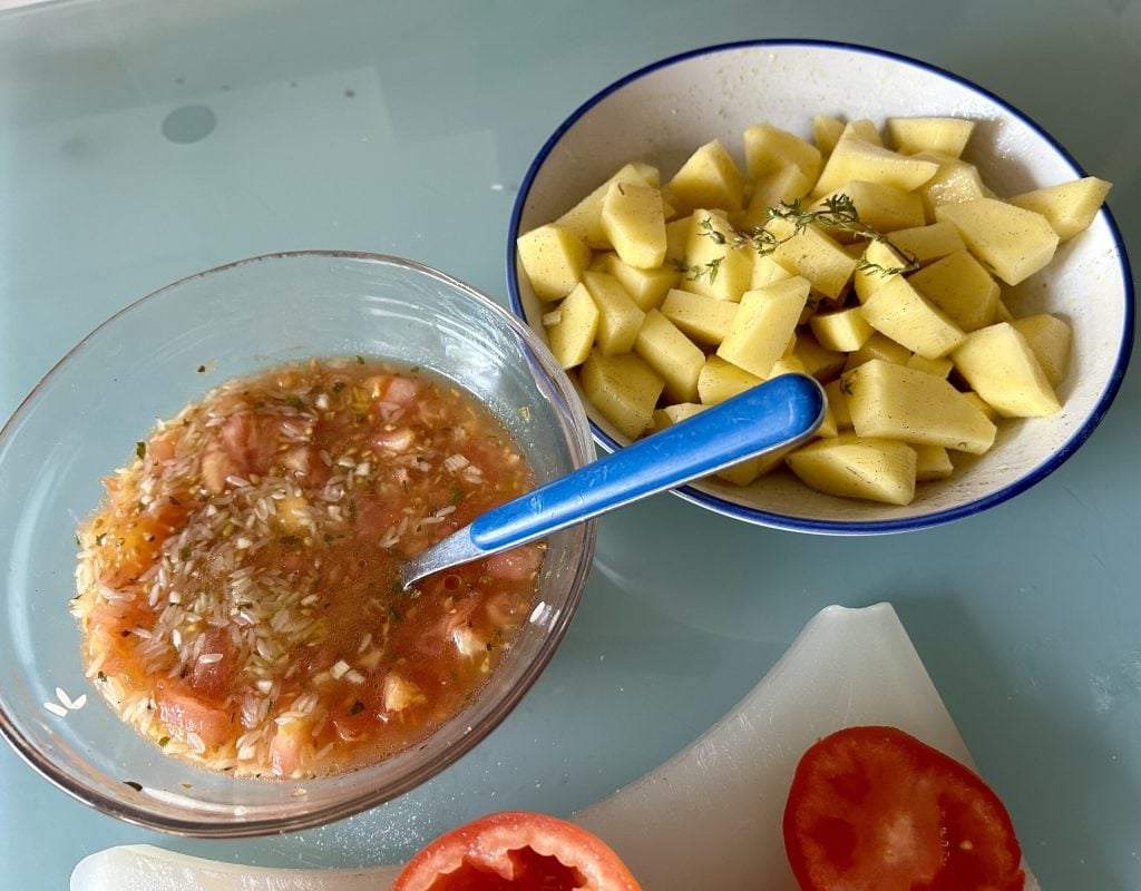 Der typische Geschmack dieses Gerichts blieb unverändert, die Knusprigkeit des Reises beeindruckte mich noch mehr als das Backen im Ofen, und die Kartoffeln bleiben innen weich, sodass sie den ganzen Geschmack und Saft der Tomate beim Garen aufnehmen.