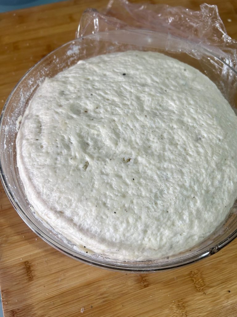 Um den Teig gut auszukneten, habe ich ihn auf die leicht bemehlte Arbeitsfläche gebracht, den Teig ein paar Mal gewendet und dann eine Kugel geformt, die ich wieder in die Glasschüssel gelegt habe. Ich habe den Teig mit Folie abgedeckt und alles etwa zwei Stunden lang gehen lassen, bis er sich verdoppelt hat.