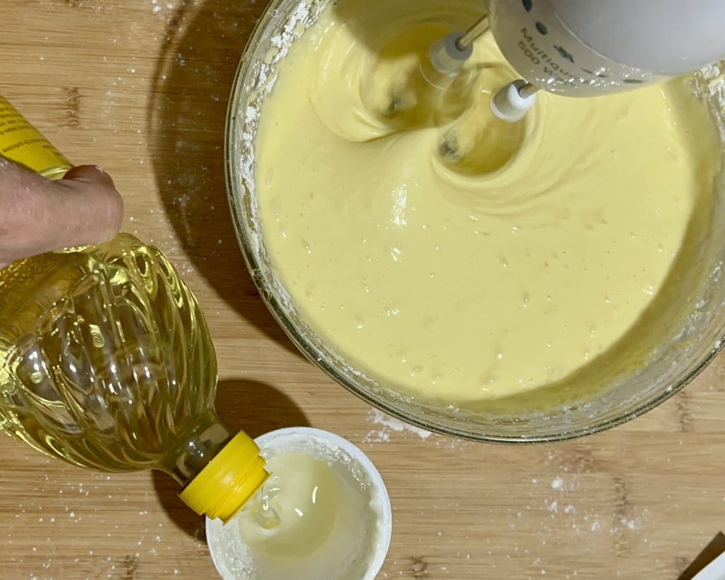 Nachdem die Eier gut eingearbeitet sind, kommen die anderen Zutaten hinzu. Wir fügen zwei Becher Mehl hinzu und rühren weiter mit dem elektrischen Schneebesen, um Klumpen zu vermeiden, dann einen Becher Kartoffelstärke, die den Kuchen noch weicher macht. Dann fügen wir einen Becher Pflanzenöl hinzu und zuletzt das Tütchen Backpulver. Wir arbeiten den Teig weiter, bis er glatt und homogen ist: Dieser Schritt garantiert einen hohen und duftenden Gugelhupf, perfekt zum Frühstück.