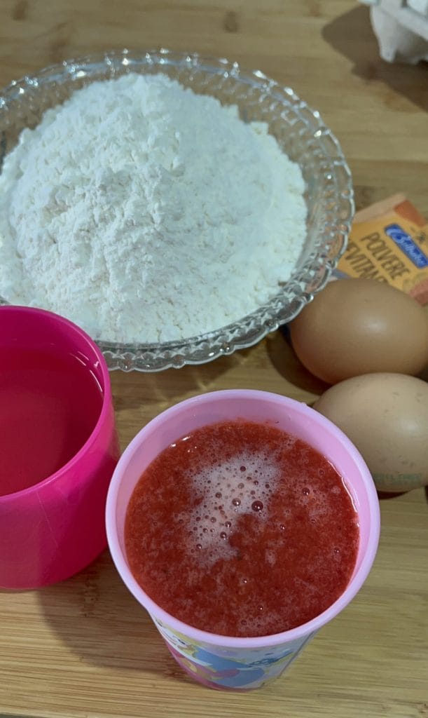 Zuerst habe ich die Erdbeeren mit einem Stabmixer püriert, auch ihren gesamten freigesetzten Saft verwendet, da ich sie bereits mit Zucker und Zitrone gewürzt hatte. Sobald das Püree fertig war, habe ich alle Zutaten abgewogen und auf der Arbeitsfläche vorbereitet, um den Teig schneller und praktischer zuzubereiten.