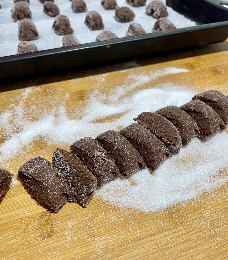 Nach der Ruhezeit nehmen Sie den Teig heraus, teilen ihn in zwei Teile und rollen ihn mit den Händen zu einer dicken Rolle. Streuen Sie etwas Kristallzucker auf die Arbeitsfläche und rollen Sie die Rollen darin, um sie von außen vollständig zu bedecken. Schneiden Sie nun mit einem glatten Küchenmesser Ihre Kekse, etwa einen Zentimeter dick, legen Sie sie auf das mit Backpapier belegte Blech und backen Sie sie schließlich in einem vorgeheizten Ofen bei 170°C für etwa 12 Minuten. Überprüfen Sie den Boden, ob sie gebacken sind, aber sie sollten weich bleiben, und beachten Sie, dass sie beim Abkühlen etwas trockener werden. Wir brauchten zwei Backbleche, da insgesamt 48 Kekse herauskamen.