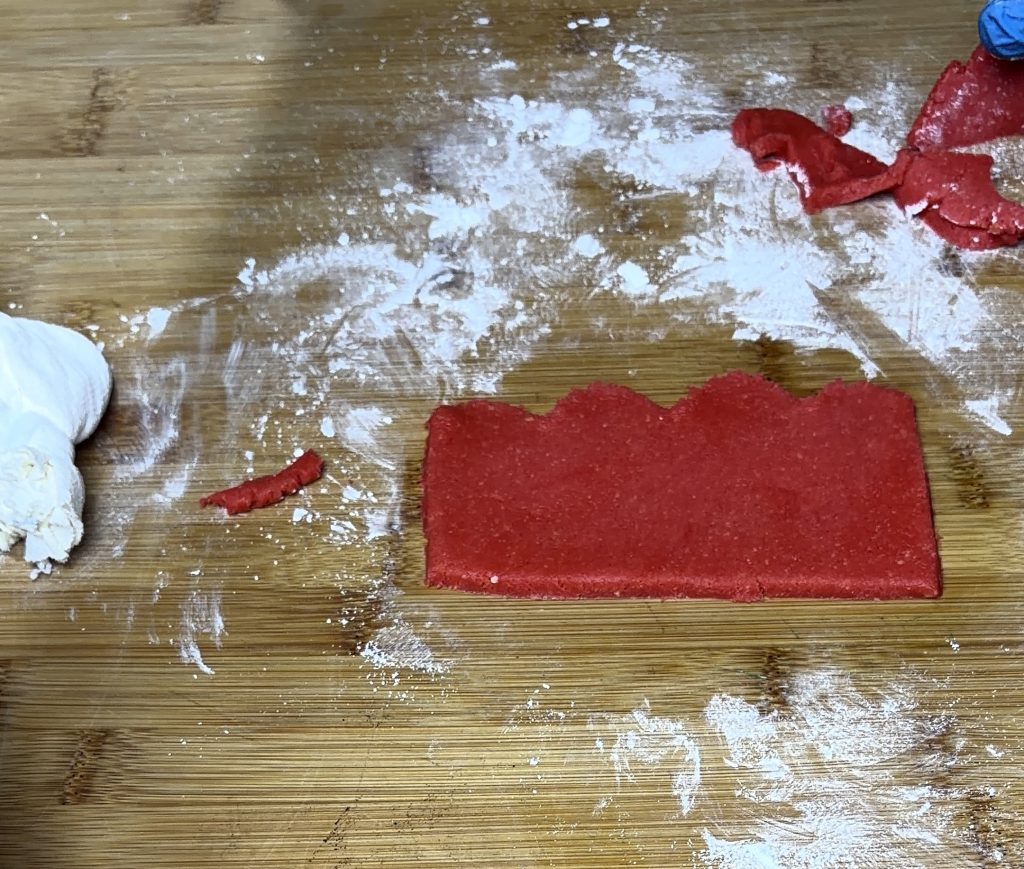 Ich habe einige Stücke mit rotem Lebensmittelfarbstoff gefärbt, um den Umschlag des Sockens und eine Schleife zu machen.