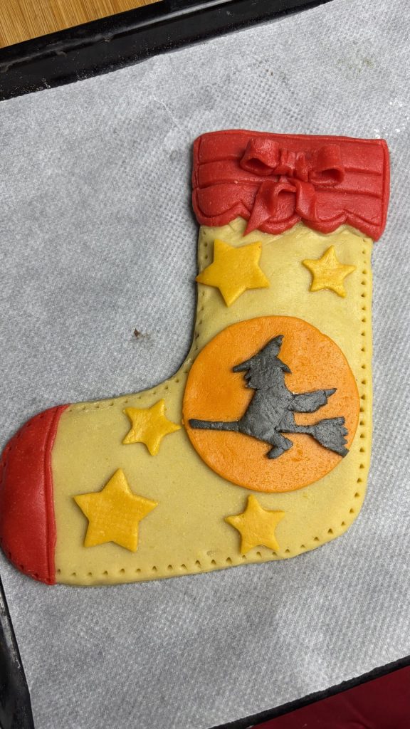 Ich habe einen knusprigen Mürbeteig gemacht, nur mit Eigelb im Teig und einer Prise Backpulver, weil ich einen hübschen und leichten Socke wollte, ideal zum Dekorieren. Für die Dekorationen habe ich mich amüsiert, eine Schleife und eine stilisierte kleine Hexe zu kreieren, aber auch Sterne oder Schneeflocken sind in Ordnung, ohne es zu kompliziert zu machen.