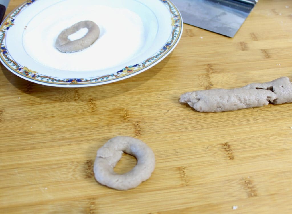 Den Teig mit den Händen bearbeiten, bis er eine kompakte und glatte Kugel bildet. Er sollte nicht kleben, aber weich bleiben, ähnlich der Konsistenz von Mürbeteig. Nehmen Sie Teigstücke und rollen Sie sie mit den Händen aus, wie man es für Gnocchi macht. Formen Sie die Ringkekse in der von Ihnen gewünschten Größe; ich habe Stangen von etwa 10/12 cm Länge gemacht. Versuchen Sie, die Ringkekse gleichmäßig zu halten, damit sie gleichmäßig backen.