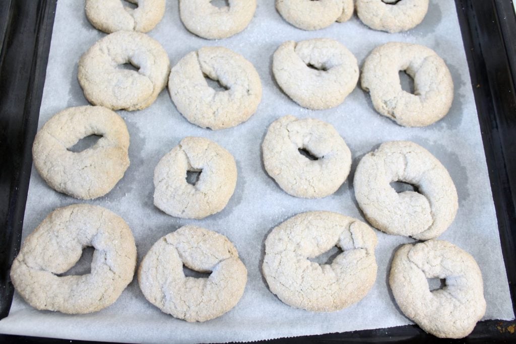 Machen Sie sich keine Sorgen, wenn die Ringkekse ein wenig flach werden, während Sie sie im Zucker wälzen; sie werden im Ofen wieder aufgehen. Legen Sie sie auf das Blech, lassen Sie einen Abstand von 3-4 cm zwischen den Keksen, um das Aufgehen zu ermöglichen. Backen Sie sie in einem bereits heißen Ofen und backen Sie sie etwa 25 Minuten. Sie sind fertig, wenn Sie einen Ringkeks anheben und der Boden goldbraun ist. Nehmen Sie sie aus dem Ofen und lassen Sie sie abkühlen, bevor Sie sie servieren.