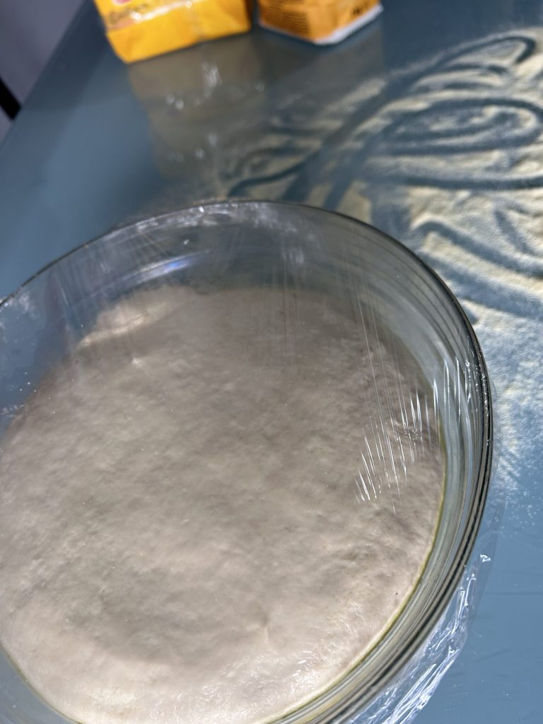Lassen Sie die Zutaten gut vermischen und hören Sie auf zu kneten.Ölen Sie einen Glas- oder Plastikbehälter gut ein, nehmen Sie den Teig mit geölten Händen und geben Sie ihn in den Behälter. Formen Sie ihn zu einer Kugel, indem Sie die Ränder mit geölten Händen nach unten drücken.