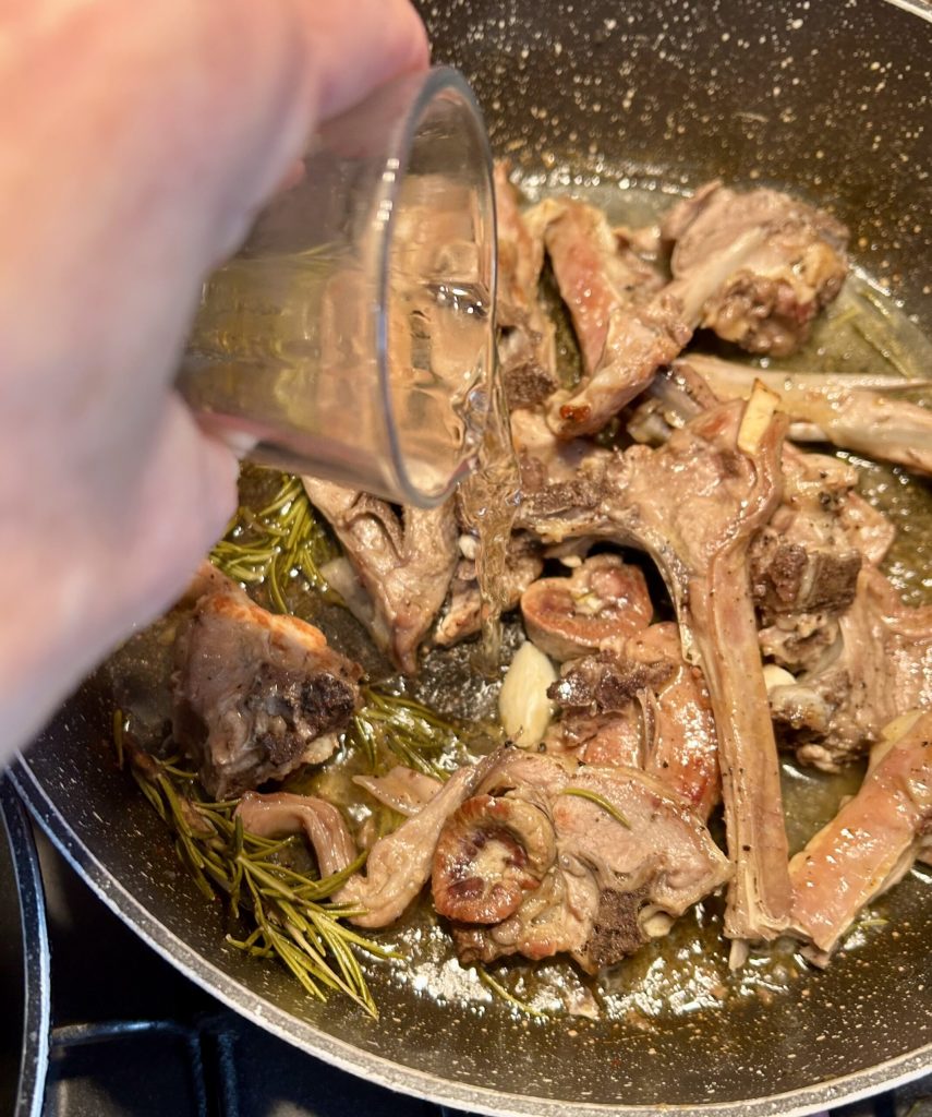 Wenn die Koteletts fast fertig sind – etwa 20-25 Minuten vergangen sind -, erhöhen wir wieder die Hitze und löschen mit einer Mischung aus Wasser und Essig ab: Ich benutze eine Espressotasse, die ich zur Hälfte mit Wasser und zur Hälfte mit Essig fülle. Die Knoblauchzehen leicht zerdrücken und in die Pfanne geben. Gut verdampfen lassen und den Kochfond reduzieren lassen. An diesem Punkt sind unsere Lammkoteletts nach Jägerart fertig, duftend und super lecker!