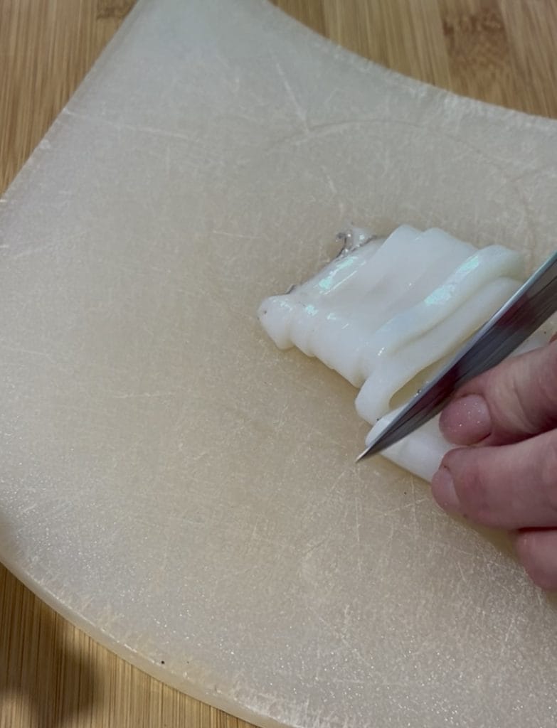 • Reinige die Tintenfische, indem du die Haut, den Schnabel und den inneren Knorpel entfernst. Spüle sie gründlich unter kaltem fließendem Wasser ab.
