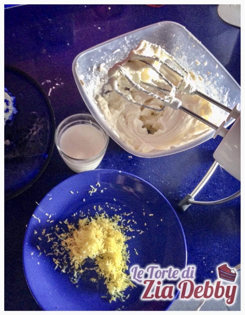• In einer Schüssel pürieren Sie den Frischkäse mit dem Puderzucker, dann fügen Sie die flüssige Sahne mit der aufgelösten Gelatine, den Zitronensaft und die Zitronenschale hinzu. Zum Schluss schlagen Sie die restliche Sahne auf und fügen sie mit kreisenden Bewegungen von Hand zur Creme hinzu.