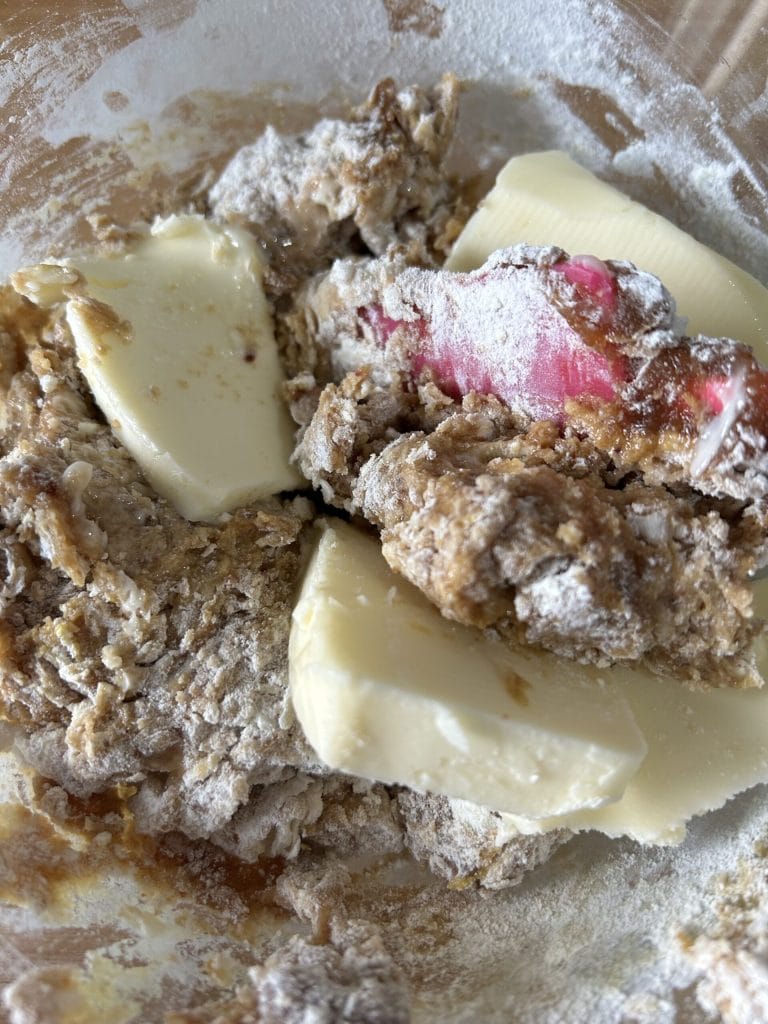 In einer Schüssel habe ich das Mehl und die Maisstärke miteinander vermengt, dann habe ich das Ei, die weiche Butter und die Dattelcreme hinzugefügt und begonnen, mit den Händen zu kneten. Der Teig ist weich und leicht klebrig, aber keine Sorge: Nach der Ruhezeit wird er perfekt zu verarbeiten sein.