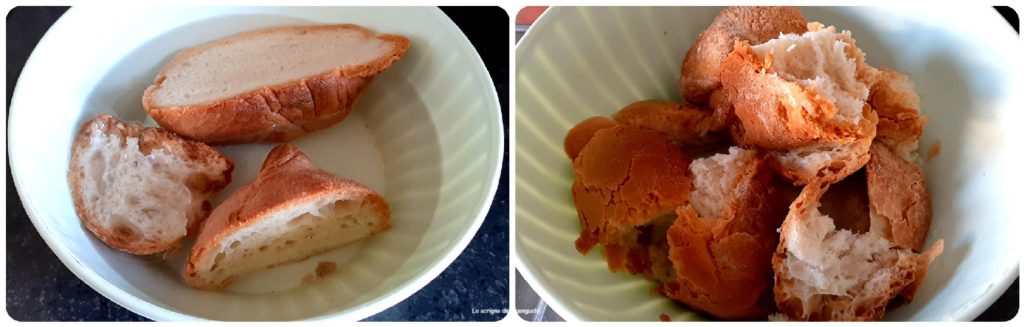 Nehmen Sie das altbackene Brot, tauchen Sie es für einige Minuten in Wasser, sobald es anfängt weich zu werden, zerlegen Sie es in Stücke und lassen Sie es im Abtropfsieb abtropfen.