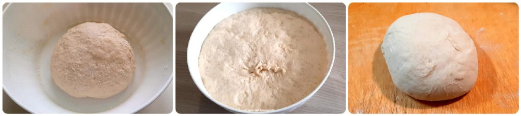 Nach dem Aufgehen den Teig erneut bearbeiten, eine Kugel formen, erneut abdecken und bis zur Verdoppelung gehen lassen.