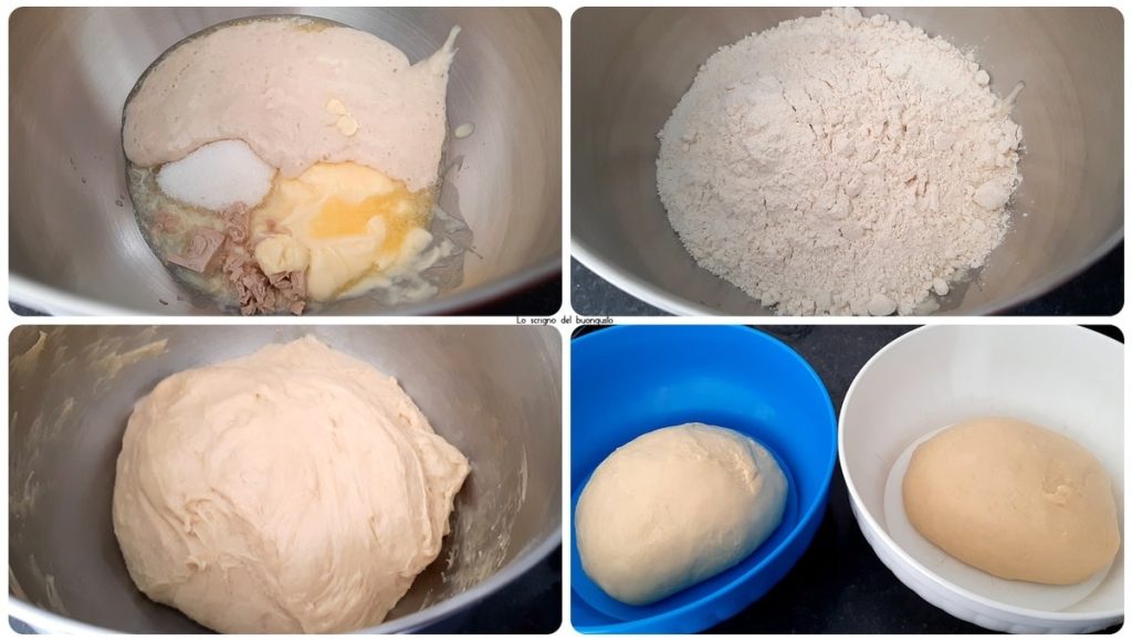 • Nach 24 Stunden die Küchenmaschine nehmen und mit der Teigherstellung beginnen, indem die Milch, die weiche Butter, der Zucker, das Eigelb, die Hefe in die Schüssel der Maschine gegeben und alles für einige Minuten gut gemischt wird.