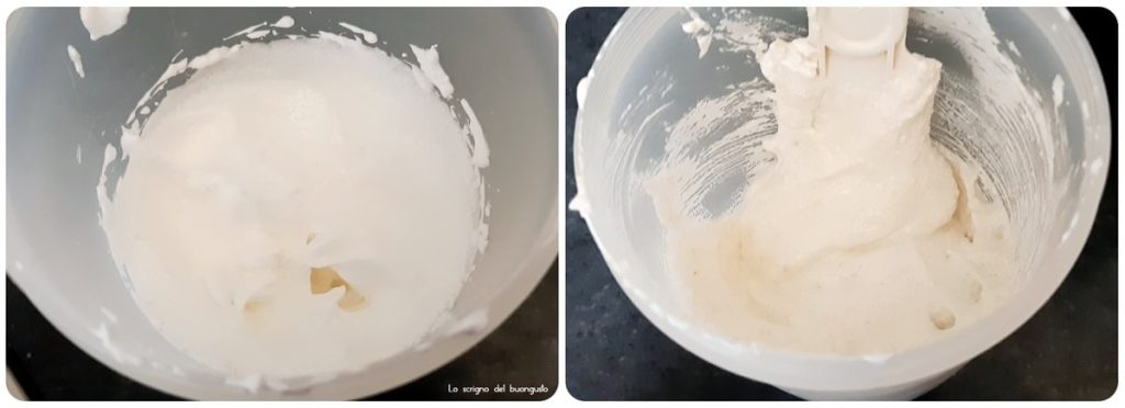 • In der Zwischenzeit die Glasur für die Oberfläche vorbereiten, indem die Eiweiße mit dem Zucker steif geschlagen werden, dann von Hand das Mandelmehl gut unterrühren und bis zur Verwendung im Kühlschrank aufbewahren.