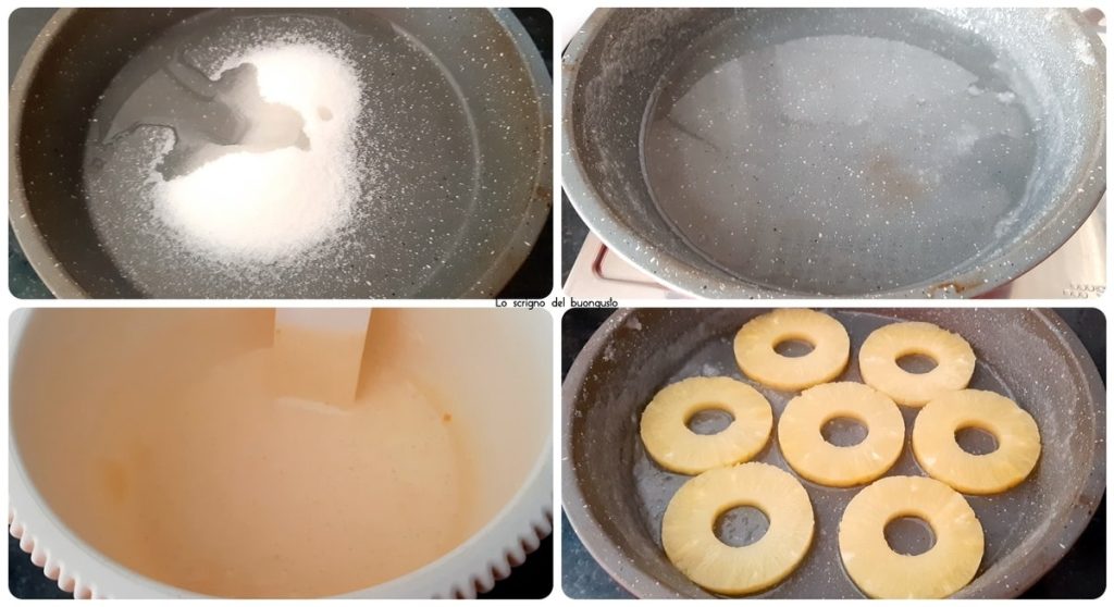 Wenn der Kuchen fertig gebacken ist, lassen Sie ihn abkühlen, dann stürzen Sie ihn und drehen Sie ihn auf einen Servierteller; er wird mit den Ananasscheiben oben präsentiert.