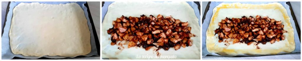 Eine rechteckige Backform nehmen, mit Backpapier auslegen und den ausgerollten Teig darauflegen. Die gewürzte Apfelmasse darauf verteilen und dabei an den Rändern zwei Finger frei lassen. Die Ränder des Teigs rundherum mit dem verquirlten Eigelb und einem Schuss Wasser bestreichen.