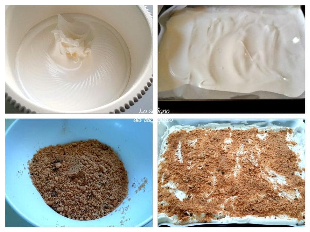 Mischen Sie in einer Schüssel die gemahlenen Kekse (ich habe Gocciole-Kekse verwendet), Zucker, Zimt und verteilen Sie es auf dem Baiser.