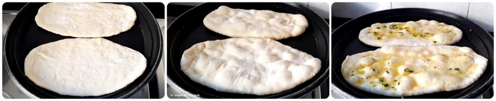 Nach der Ruhezeit eine Pfanne mit dickem Boden erhitzen und jede Kugel zu einem langen, schmalen Streifen ausrollen, auf die bereits heiße Pfanne legen, bei mittlerer Hitze kochen und sobald sie auf der Pfanne liegen, die Oberfläche bestreichen.