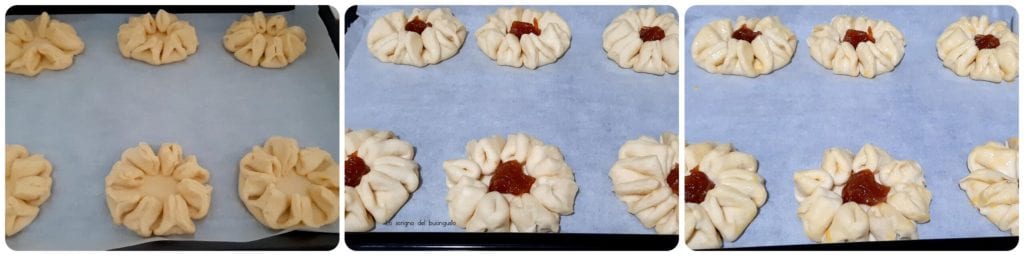 Sobald die Blumen geformt sind, sie auf ein mit Backpapier ausgelegtes Backblech legen, eine halbe Stunde ruhen lassen, dann die Mitte der Blume mit Marmelade füllen, die Brioche mit dem leicht mit Wasser verdünnten Eigelb bestreichen und im vorgeheizten Ofen bei 180 °C 25 Minuten backen.