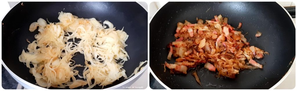 In der Zwischenzeit die Füllung vorbereiten, indem man eine antihaftbeschichtete Pfanne nimmt, Butter und Olivenöl hineingibt, die Butter mit dem Öl schmelzen lässt, die Zwiebeln schält und dünn schneidet und für ein paar Minuten anbrät, bis sie glasig werden.