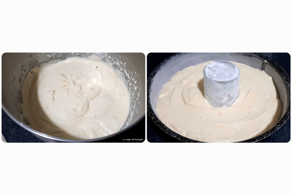 Eine Kringelbackform (oder eine nicht-Kringelbackform, indem man ein Glas in die Mitte stellt) mit einem Durchmesser von 26 cm vorbereiten, einfetten und mehlen.