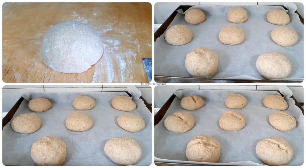 Den Teig in 11 Kugeln teilen, auf ein mit Backpapier belegtes Backblech legen, leicht flach drücken, an der Oberfläche einschneiden und erneut etwa eine Stunde gehen lassen.