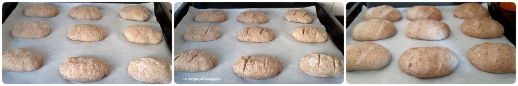 Aus jedem Bällchen längliche oder runde Brötchen (nach Belieben) formen, die Brötchen auf ein mit Backpapier ausgelegtes Backblech legen, an der Oberfläche einschneiden und noch eine Stunde gehen lassen.