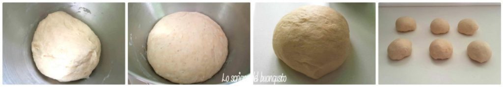 Wenn der Teig aufgegangen ist, nehmen wir ihn zurück, kneten ihn kurz durch, um einen Teigball zu formen, und teilen ihn in 6 Teile, um kleine Bällchen zu formen