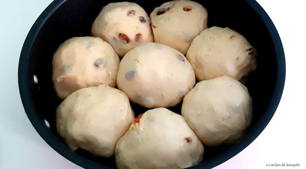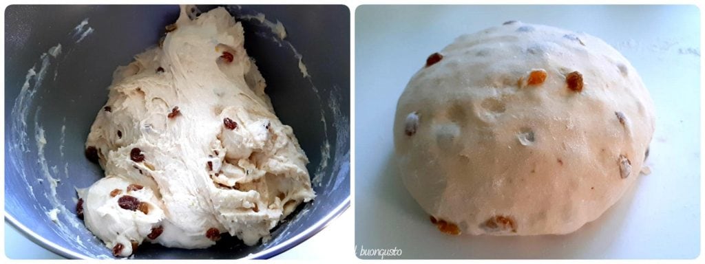 Jetzt die Sultaninen abtropfen lassen, gut trocknen und dem Teig hinzufügen, die Küchenmaschine nur so lange laufen lassen, bis die Sultaninen im Teig aufgenommen sind, dann auf einer bemehlten Arbeitsfläche eine gleichmäßige Kugel formen.