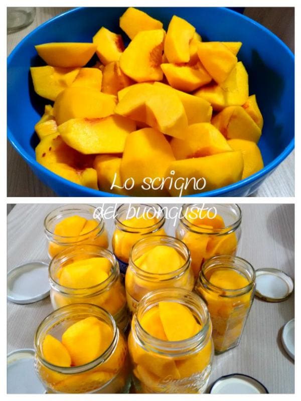 Bereitet die Gläser vor und füllt sie mit den geschnittenen Pfirsichen, dann fügt die abgekühlte Flüssigkeit hinzu, bis die Pfirsiche bedeckt sind. Verschließt die Gläser gut, stellt sie in einen Topf, bedeckt sie mit Wasser und lasst sie 20 Minuten kochen, sobald das Wasser kocht.
