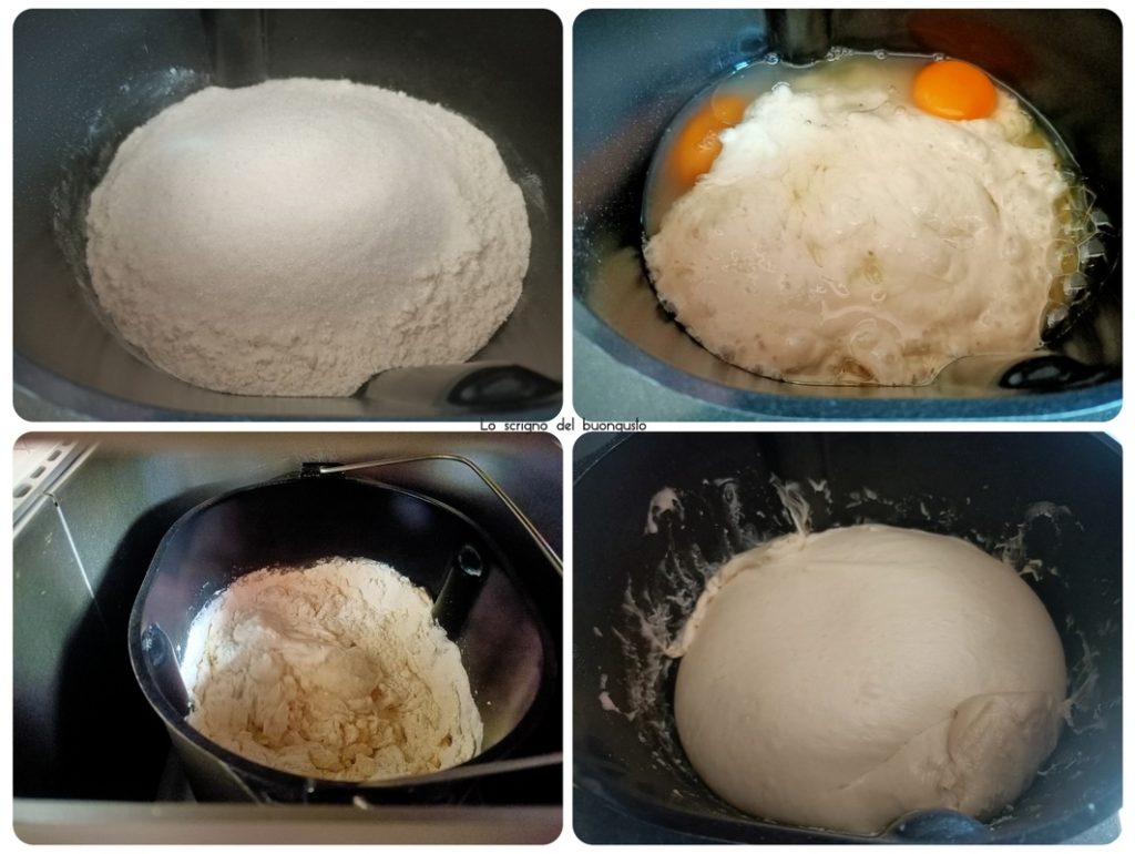 In der Brotbackmaschine die Knethaken einsetzen, Mehl, Zucker, den fertigen Vorteig und das Ei einfüllen und das Programm zum Kneten starten (bei mir Taste 17).