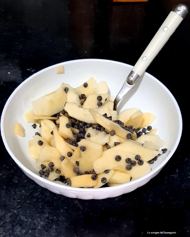 • In der Zwischenzeit die Äpfel schälen und in dünne Scheiben schneiden, 1 Esslöffel Zitronensaft und 1 Teelöffel Zucker hinzufügen, gut vermischen und die Schokostückchen untermengen; beiseitestellen.