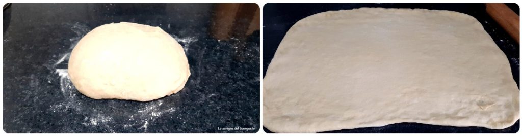 • Ist die Gärzeit erreicht, den Teig auf eine leicht bemehlte Arbeitsfläche geben, zu einer Kugel formen und mit dem Nudelholz zu einem rechteckigen, nicht zu dünnen Teigblatt ausrollen.