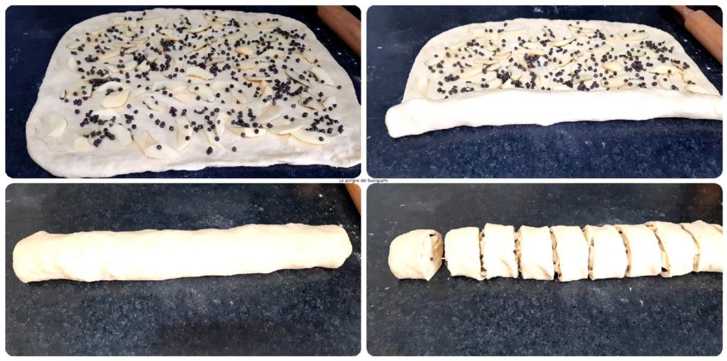 • Die Äpfel und die Schokolade gleichmäßig auf dem Teig verteilen, den Teig zu einer Rolle aufrollen und in Scheiben schneiden, jede etwa drei Finger breit (bei mir sind 11 Stück entstanden).