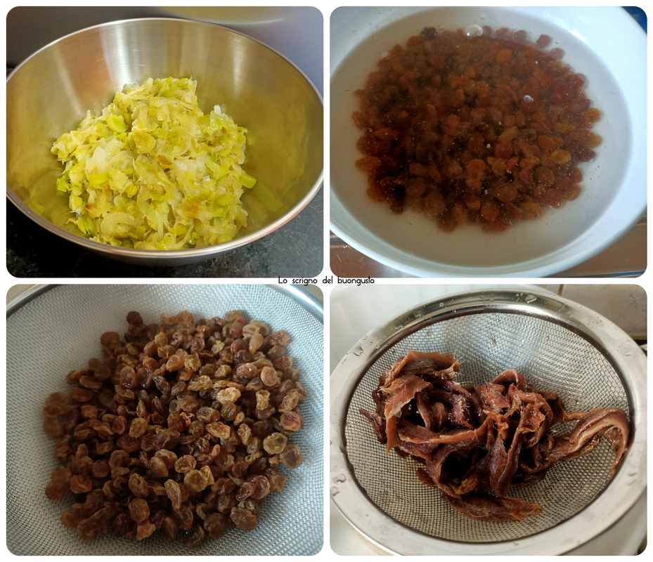 …mit den zuvor zubereiteten Zwiebeln füllen, anschließend die in Stücke gerichteten, abgetropften Anchovis und die Sultaninen darüber verteilen.