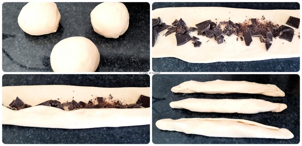 Lassen Sie sie etwa 30 Minuten ruhen, formen Sie dann aus jeder Kugel einen Streifen Teig, der ziemlich lang und etwa 3 Finger breit ist, und legen Sie auf jeden Streifen Stücke von extra dunkler Schokolade oder Nutella in die Mitte über die gesamte Länge.