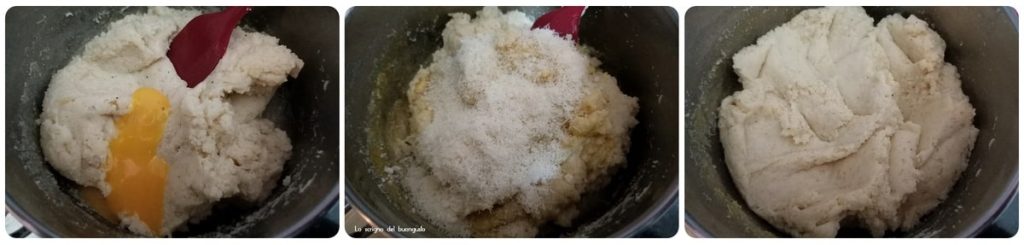• …..das Eigelb und 25 g Parmigiano hinzufügen und alles gut vermischen, um eine gut vermengte Masse zu erhalten.