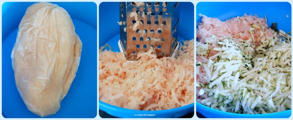 • An diesem Punkt die anderen Zutaten zum Hähnchen und den Zucchini hinzufügen… das Ei, die geriebenen Knoblauchzehen, Salz, Pfeffer, gehackte Petersilie, geriebenen Parmesankäse hinzufügen und alles gut vermischen, bis die Zutaten gut eingearbeitet sind.