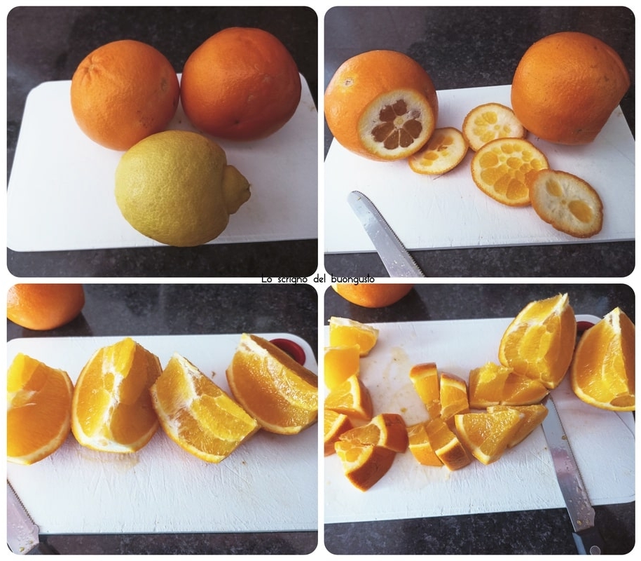 Zuerst die Orangen vorbereiten, möglichst Bio: gut waschen, dann die Enden abschneiden und die Orangen zuerst in Spalten und anschließend in Stücke schneiden.