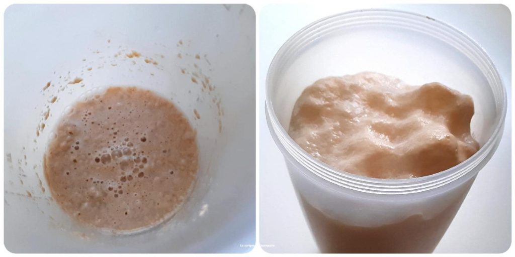 Zuerst bereiten wir den Vorteig vor, indem wir in ein hohes Glas oder ein hohes Gefäß (etwas höher als eine Handfläche) das Wasser, die Hefe und den Honig geben, gut umrühren und zum Gären in den Ofen stellen (ohne eingeschaltetes Licht), um es vor Zugluft zu schützen, etwa 30 Minuten… es sollte fast den Rand des Gefäßes erreichen.