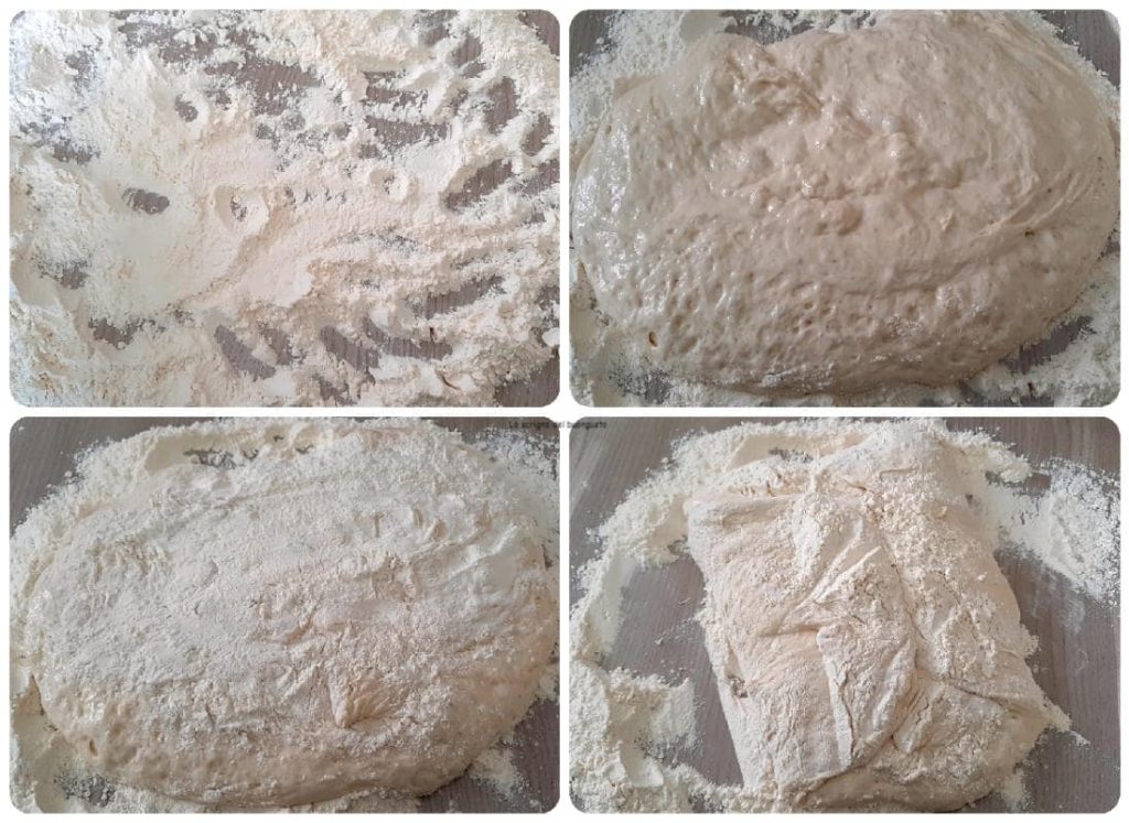 Nach dem Gären streuen wir 100 g Mehl auf die Arbeitsfläche, geben den gegangenen Teig darauf und helfen uns vielleicht mit einem Plastikspatel von außen nach innen von allen Seiten, um Falten zu bilden, da es ein weicher und klebriger Teig ist, der an den Händen klebt und auf diese Weise leichter zu handhaben ist.