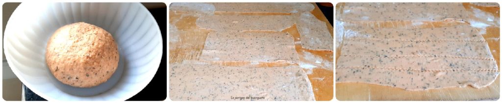 Sobald der Teig fertig ist, geben wir ihn auf eine Arbeitsfläche und verarbeiten ihn mit der Nudelmaschine zu dünnen Teigplatten, wie wir es bei Eiernudeln tun.