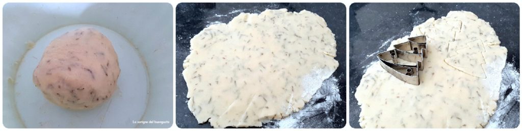 Den Teig ausrollen, eine nicht zu dünne Teigplatte herstellen und mit einer speziellen Ausstechform die Bäumchen ausstechen.