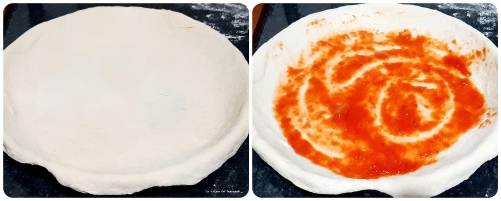 Mit der restlichen Teighälfte eine Teigscheibe ausrollen und diese auf die Pizza legen, um sie zu schließen, dann die Oberfläche der Pizza mit Öl einpinseln und die Ränder mit nassen Händen gut anpassen und die Oberfläche gleichmäßig befeuchten.