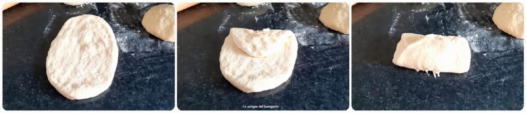 Nach der Ruhezeit jede Kugel ausrollen, um Riemen zu erzeugen, und die beiden Enden nach innen bringen,
